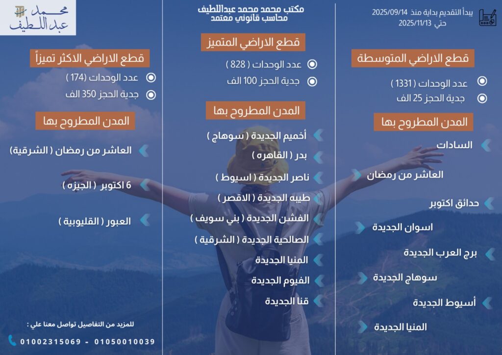 | اسيوط الجديده | المنيا الجديده | سوهاج الجديده | برج العرب الجديده | اسوان الجديده | حدائق اكتوبر | العاشر من رمضان | السادات | المدينه |